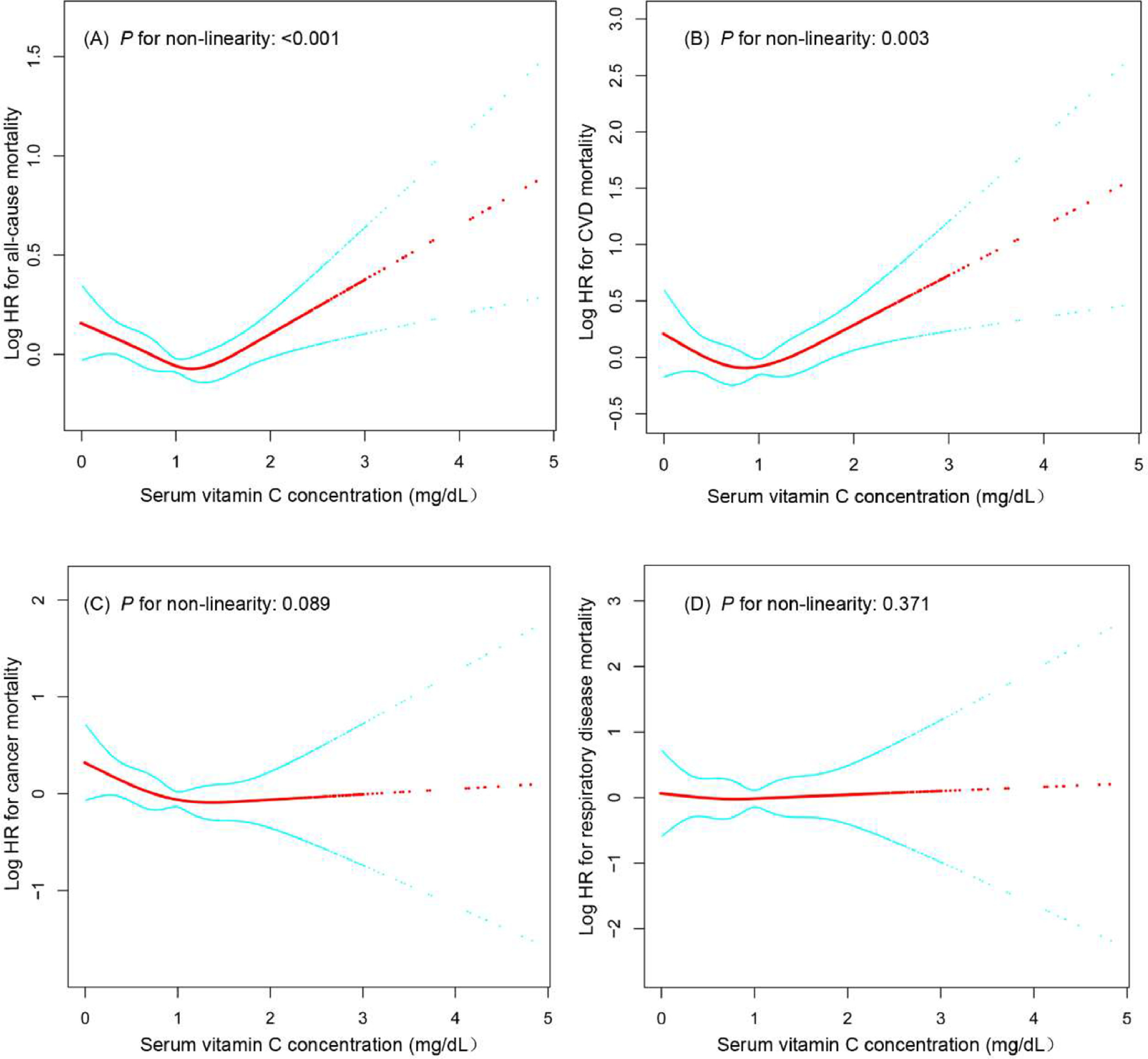 구체적으로 살펴보면, 혈중 비타민 C 농도가 약 1.06 mg/dL를 기준으로 위험도가 달라졌습니다. 이 수치보다 낮은 범위에서는 비타민 C가 증가할수록 전체 사망률과 심혈관 질환 사망률이 감소했지만, 이 기준을 초과한 이후에는 오히려 사망 위험이 유의하게 증가했습니다 .